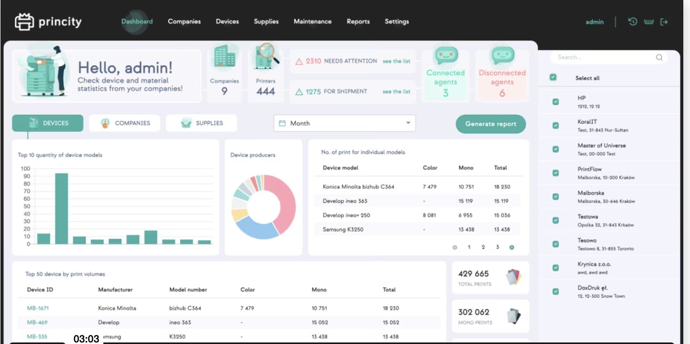 Princity es una herramienta de impresión administrada basada en web (SaaS) diseñada para hacer que los informes, los pedidos de consumibles, la gestión de fallas y la recopilación de lecturas de medidores para todos sus contratos MPS sean increíblemente simples. El monitoreo continuo y los informes automatizados permiten una fácil facturación al cliente y admite dispositivos de todos los proveedores, ahorrando hasta un 40 % en costos de impresión.